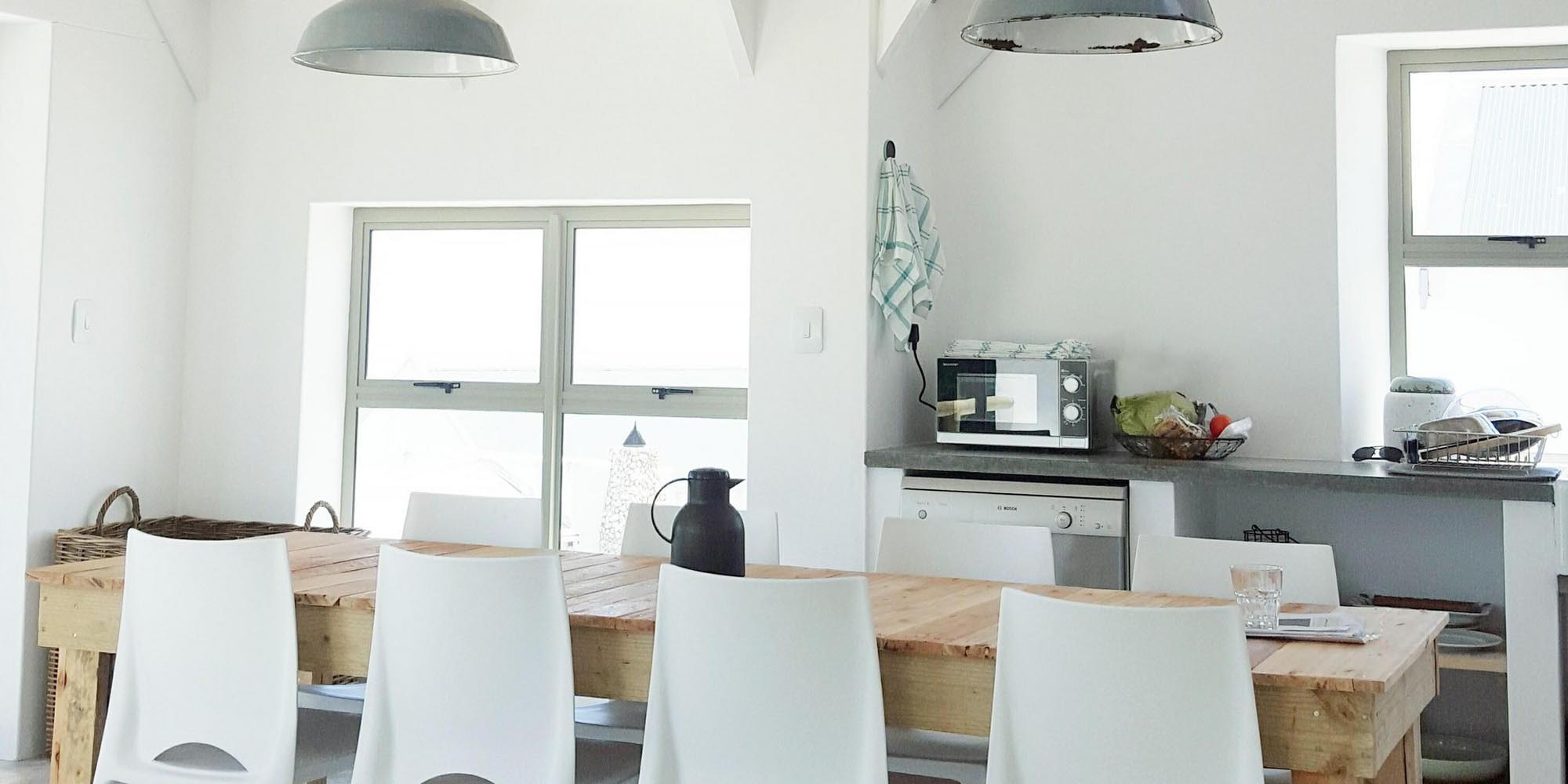 The dining area. 2.5m recycled pine table seats 8, 10 at a squeeze. Kitchen on the right, outdoor porch and braai (BBQ) area (panoramic views) to the left. Unfussy. Ready for Scrabble. Or gin rummy. Suits midnight snacking, too.